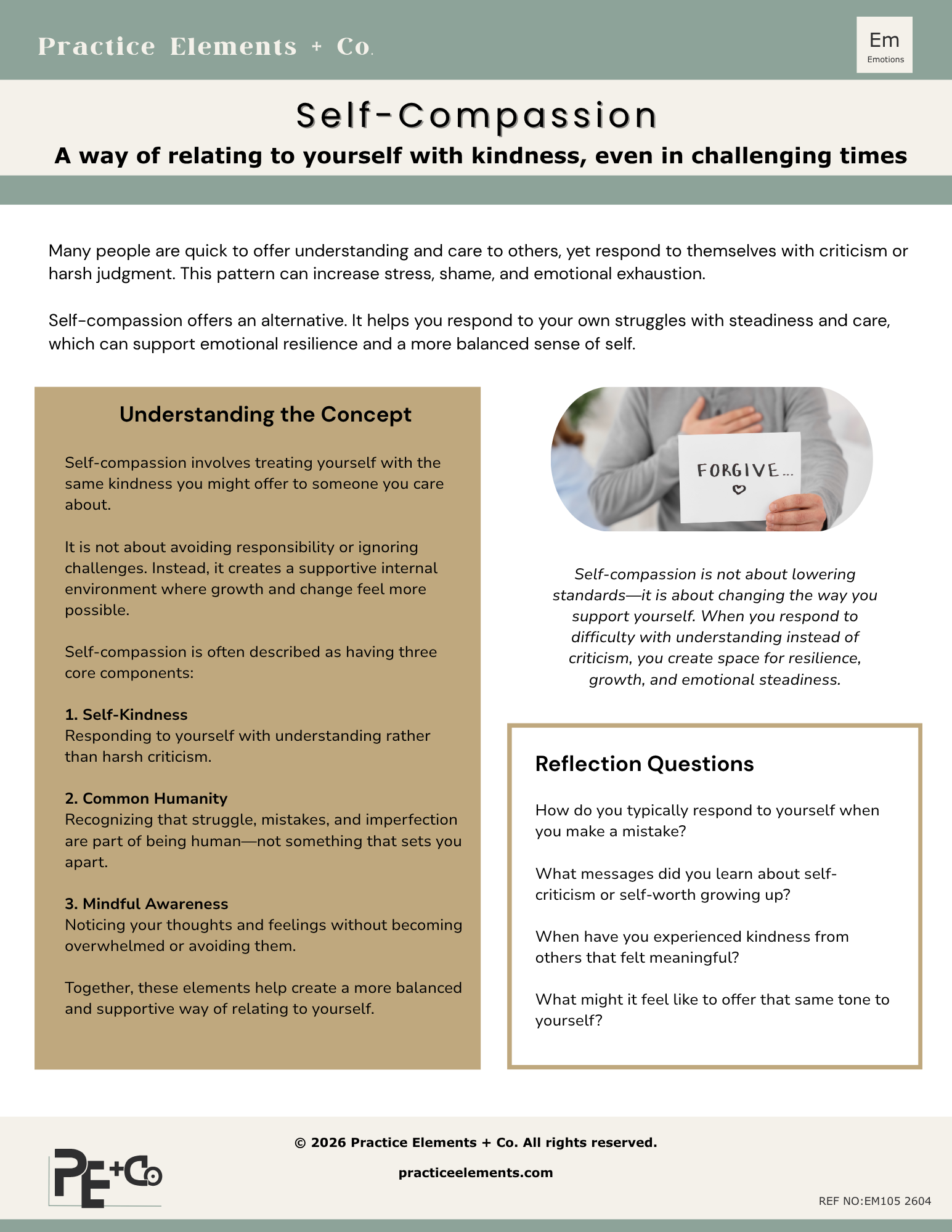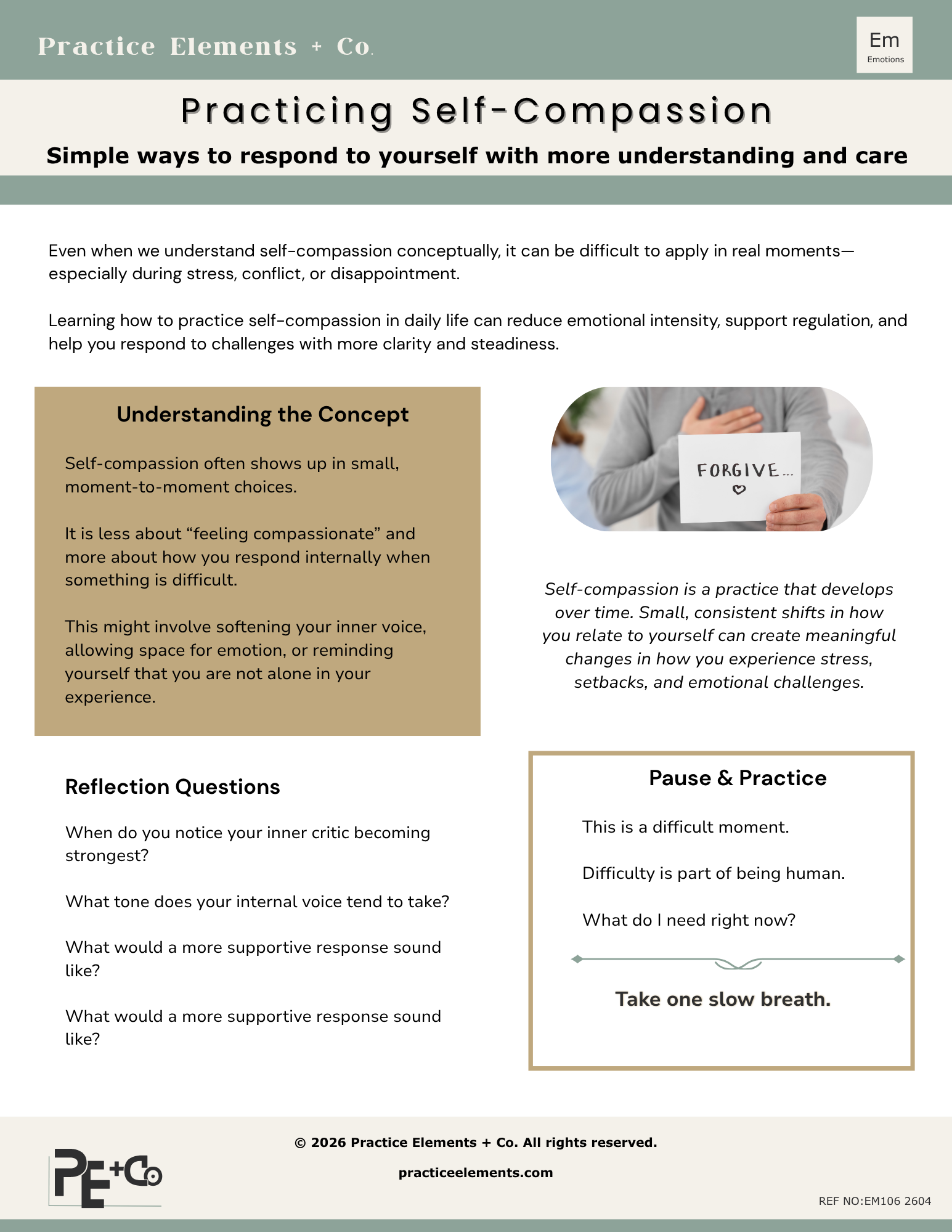 A practical handout designed to help clients translate self-compassion into everyday responses to stress, mistakes, and self-criticism.